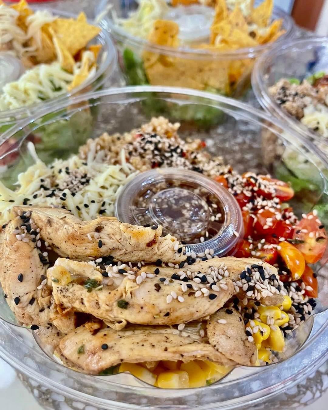Ensaladas temáticas, como la ensalada de pollo al grill o la ensalada de quinoa, perfectas para un almuerzo completo y balanceado.