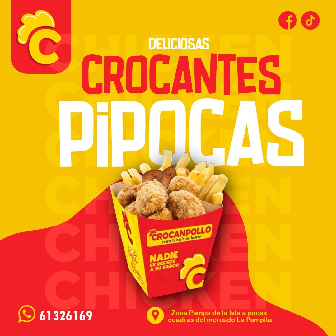 En Crocan Pollo, nos especializamos en pollo a la broaster, crujiente y sabroso, acompañado de opciones como la milanesa parmesana, las irresistibles pipocas y nuestras deliciosas burgers y salchi-burgers. Todo preparado con ingredientes frescos y de la mejor calidad para brindarte una experiencia única en cada bocado.