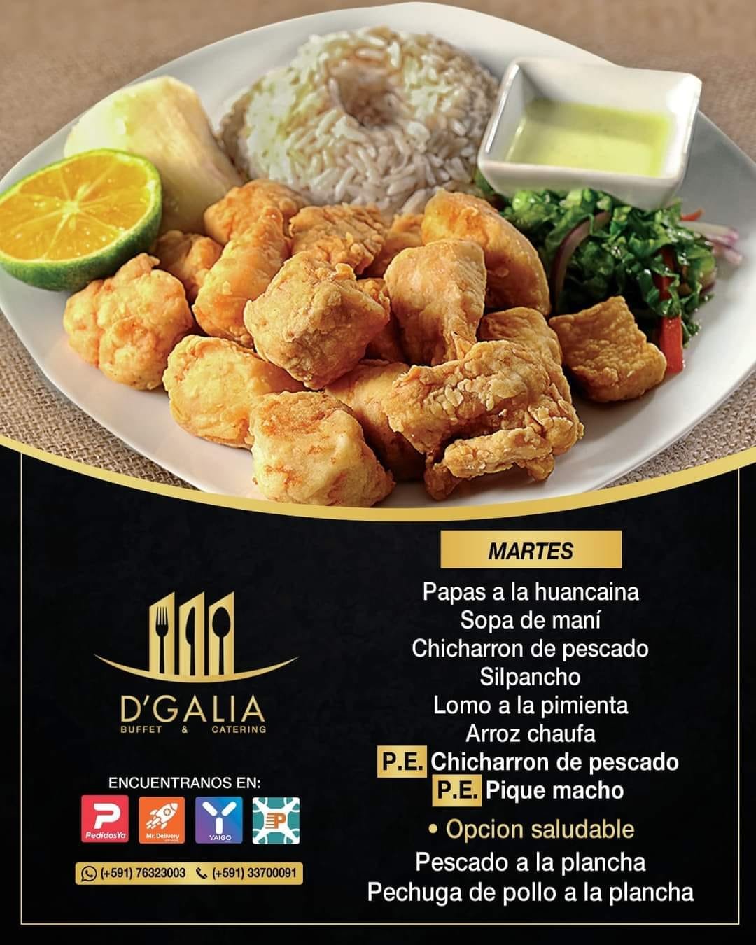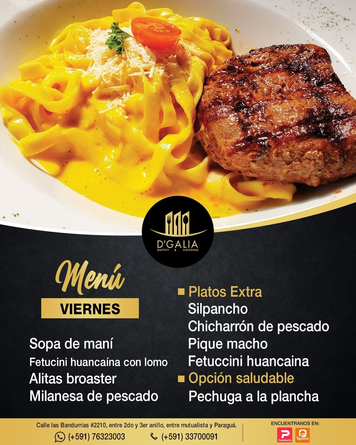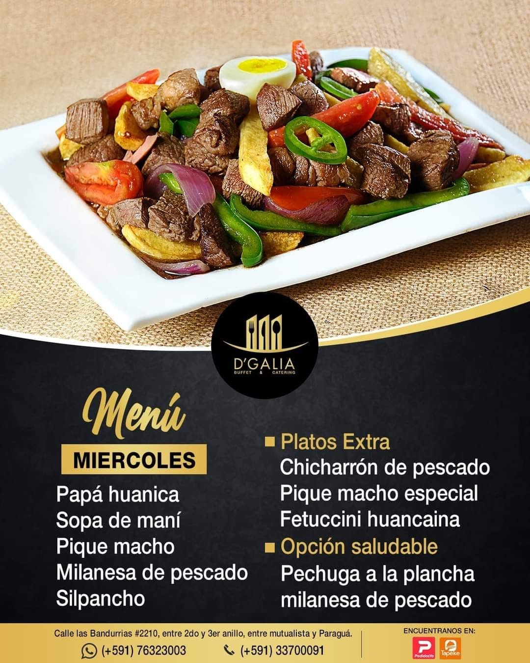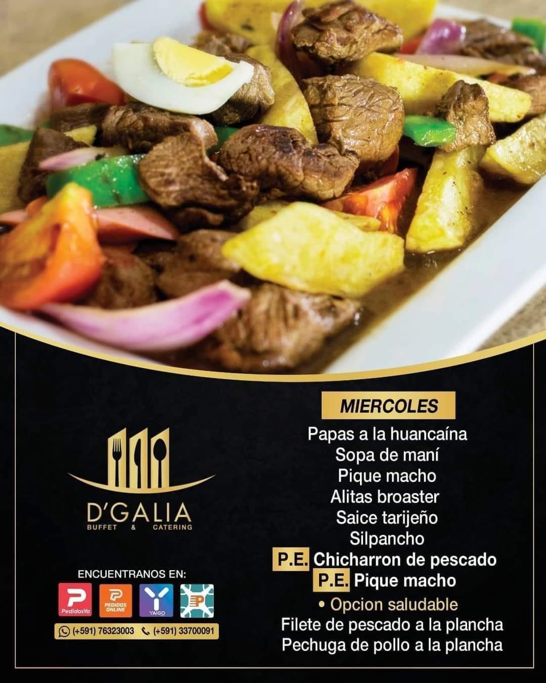 ¡Bienvenidos a D’Galia Buffet y Catering, un lugar donde los sabores tradicionales se combinan con una experiencia única de servicio a tu mesa o en tu evento especial! Ubicados en Calle Las Bandurrias #2210, entre Mutualista y Paraguá, en la Zona Noreste, ofrecemos una amplia variedad de platos que te transportarán a lo mejor de la gastronomía local.
