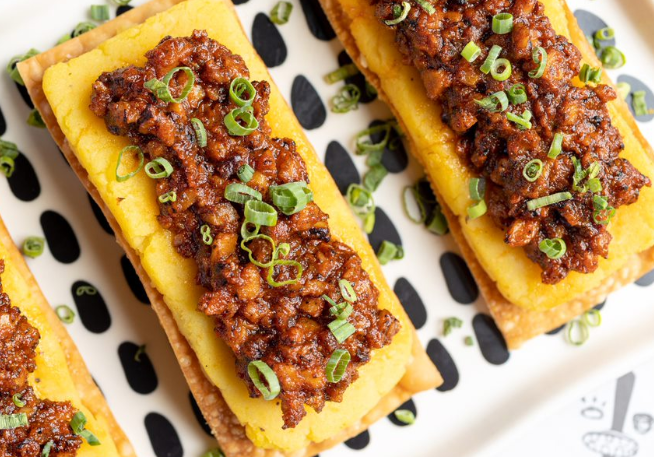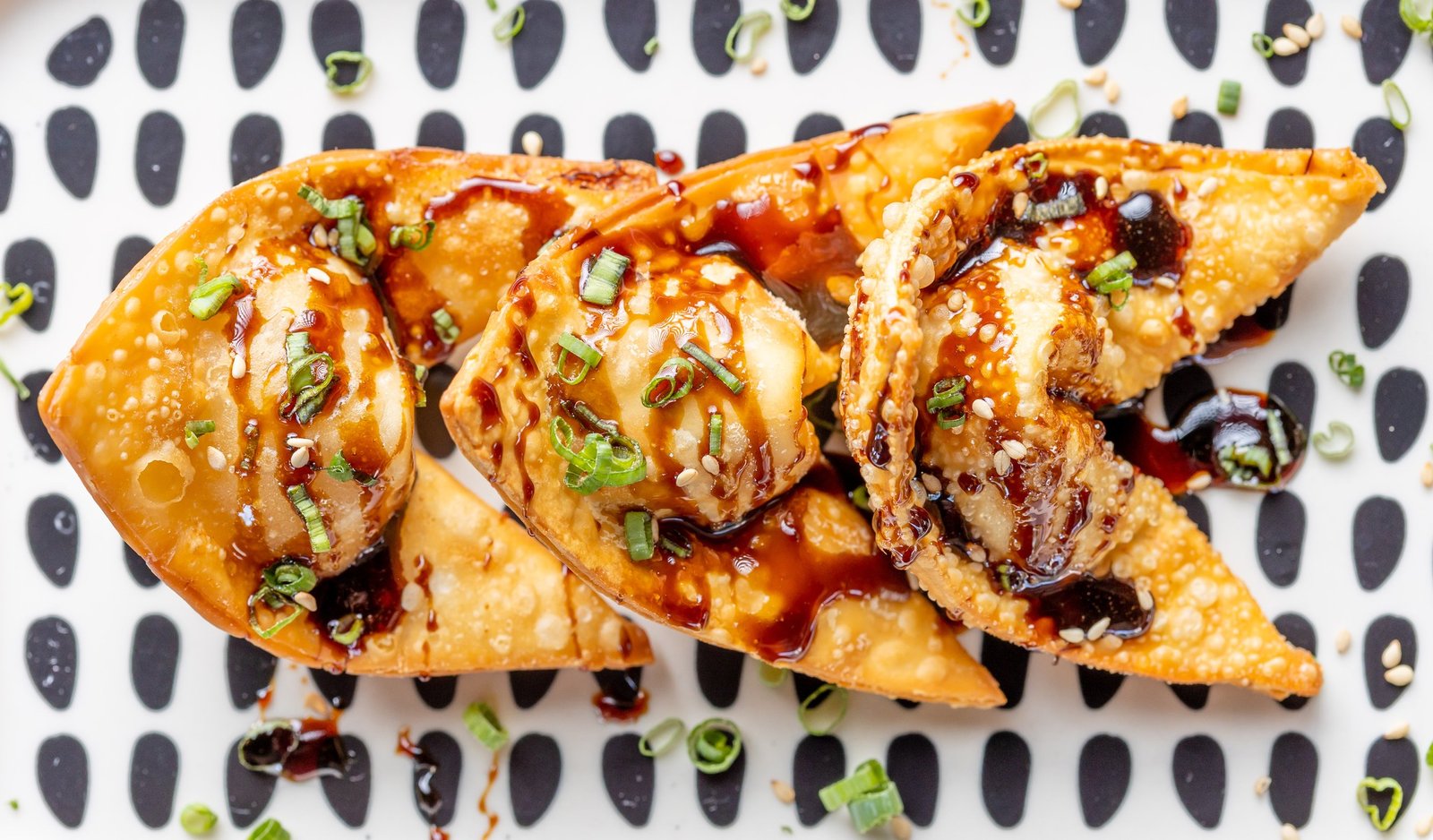 Wantón de Cangrejo 45 Bs. : Wantón relleno de cangrejo, queso crema y cebollita verde, bañado de nuestra salsa teriyaki y sésamo (3 un.)