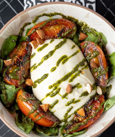Burrata 79 Bs. : Deliciosa y cremosa burrata sobre una cama de rúcula, acompañada de tomates fritos, almendra española, pesto de albahaca y miel de aceto.