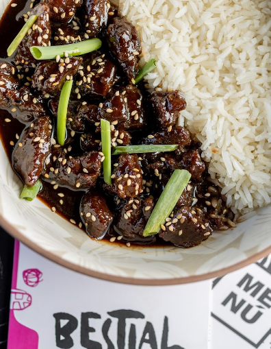 Pique Macho al Estilo Bestial 120 Bs. (2 personas) : Lomito salteado en wok, bañado en salsa de pique macho, acompañado de locoto, papas fritas y pan tostado.