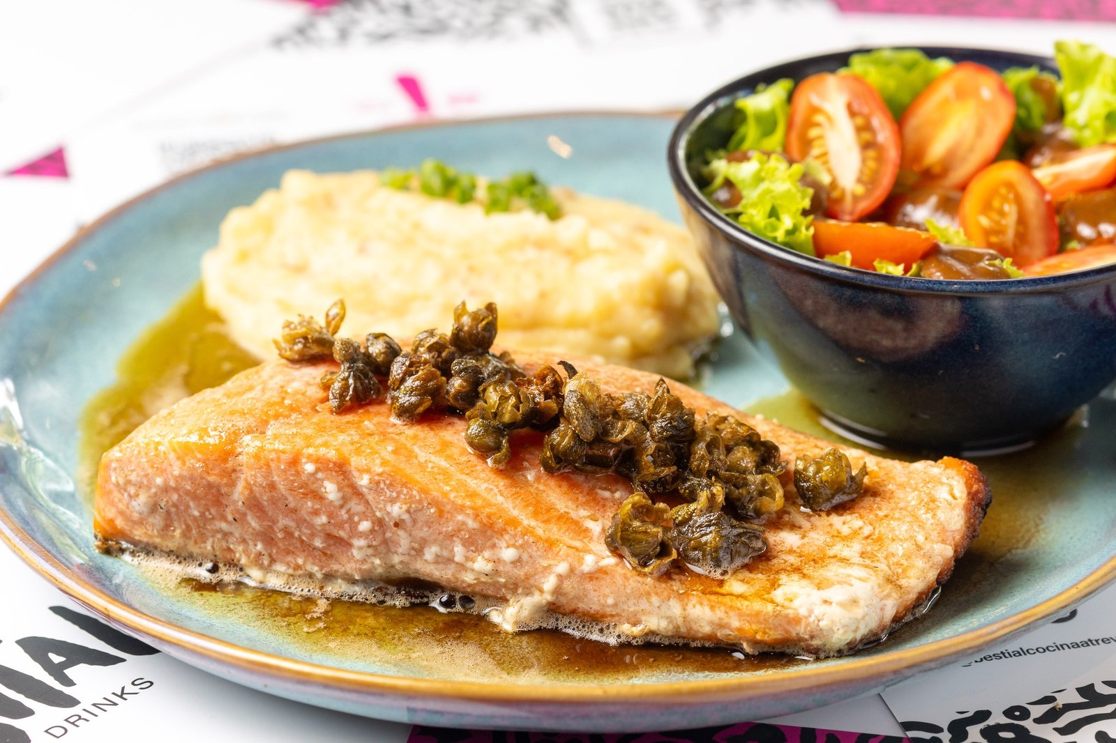 Trucha a la Alcaparra negra 95 Bs. : 250 gr de trucha salmonada con alcaparras fritas en mantequilla negra, acompañeda de puré rústico y ensalada.