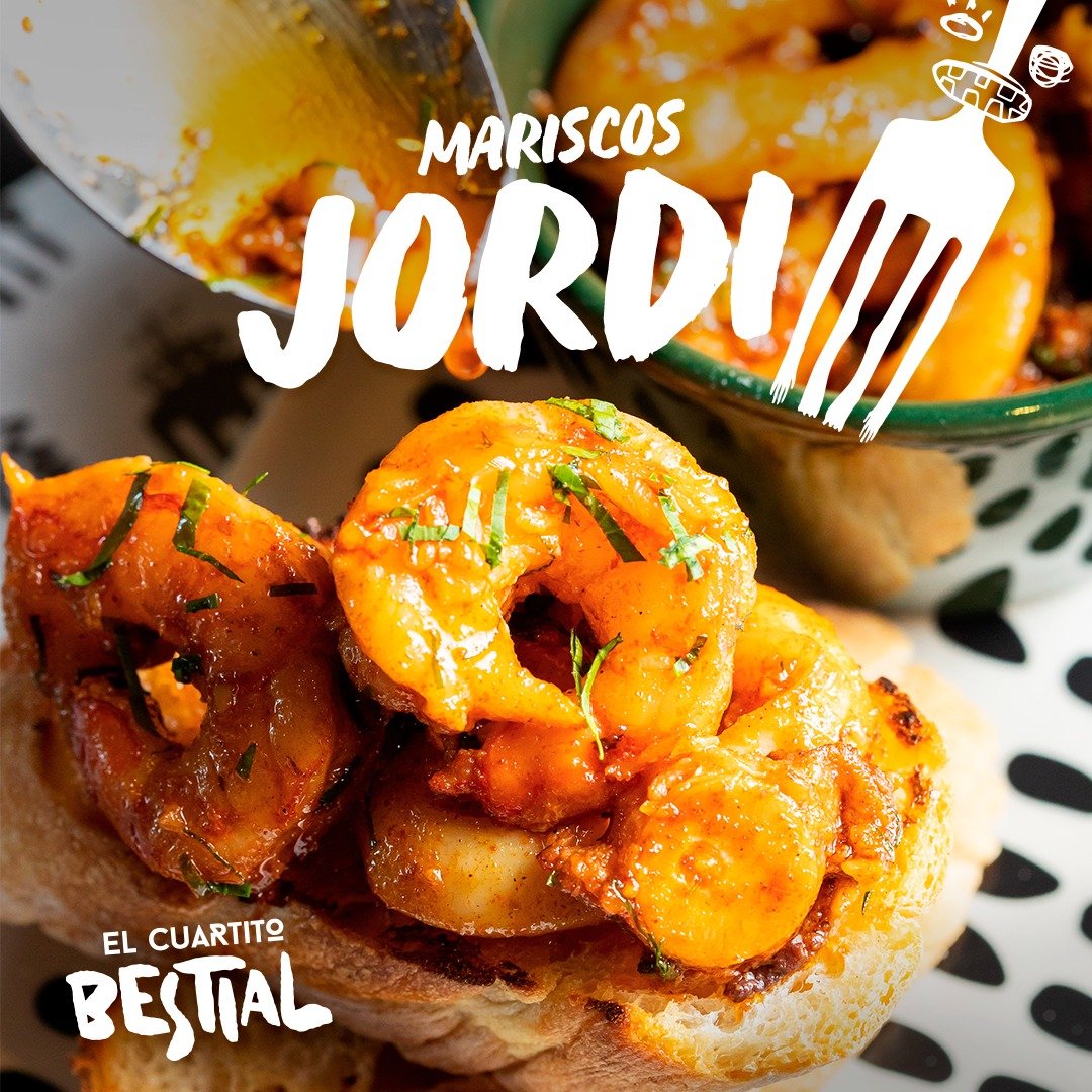 Mariscos Jordi 55 Bs. : Mix de mariscos salteados al ajillo picante, acompañado de pan baguette tostado