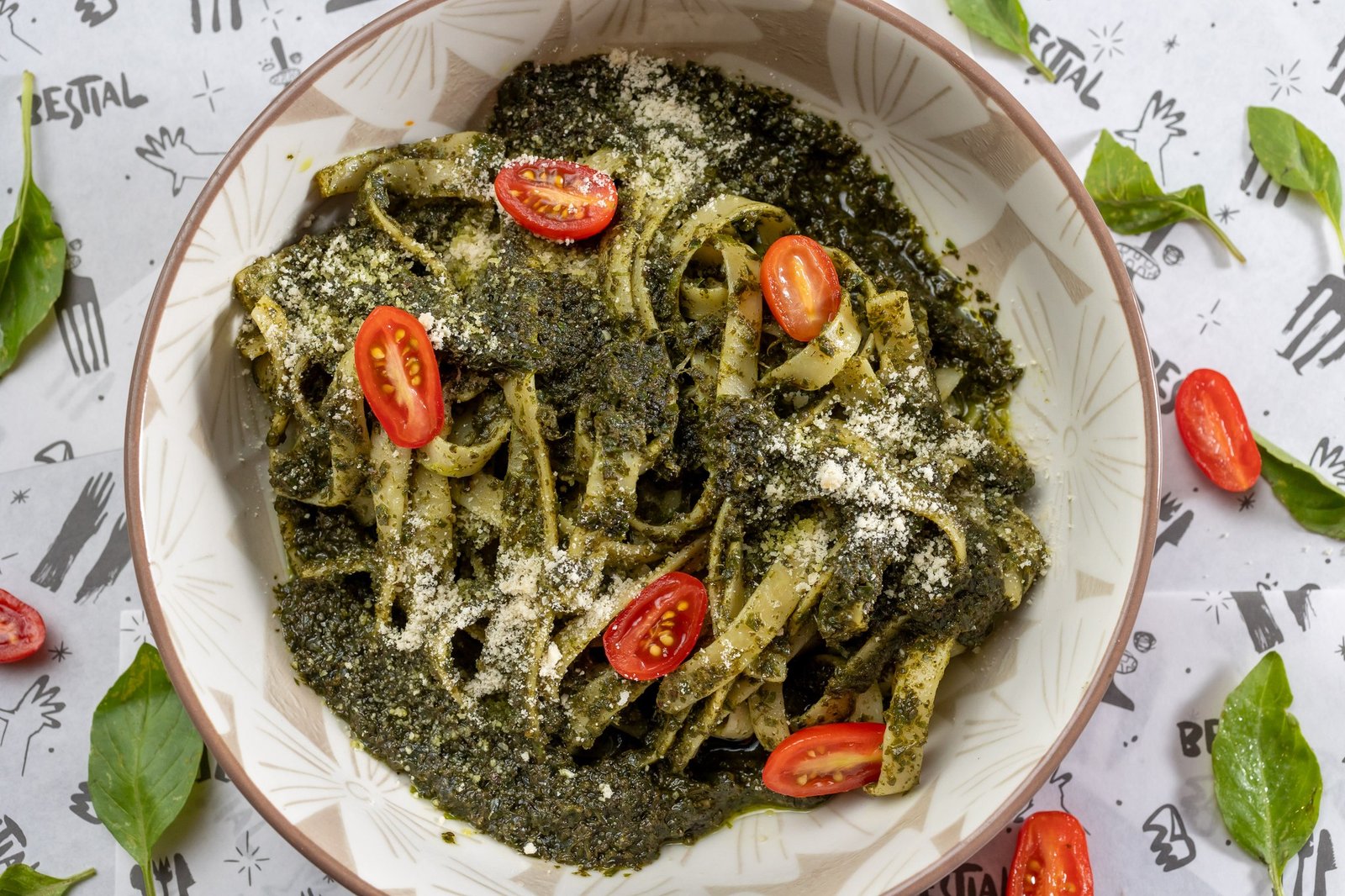 Pesto 75 Bs. (adicional pollo +15Bs.) : Salsa a base de aceite de oliva virgen extra, albahaca, almendra española, ajo y queso parmesano.