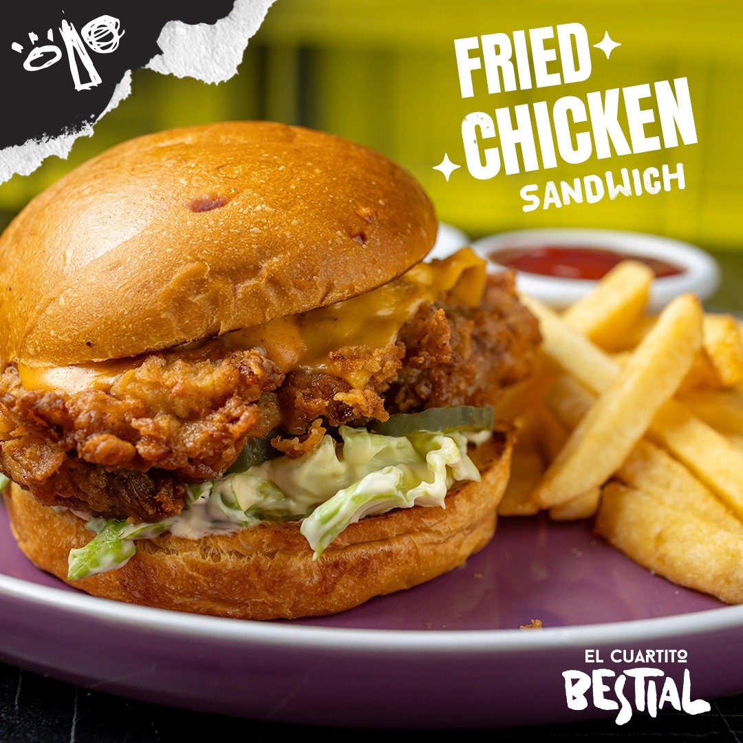 Fried Chicken Sandwich 70 Bs. : Pan brioche tostado, pollo apanado frito, doble queso cheddar, lechuga, pepinillos, mayonesa y salsa bestial + papas y sa