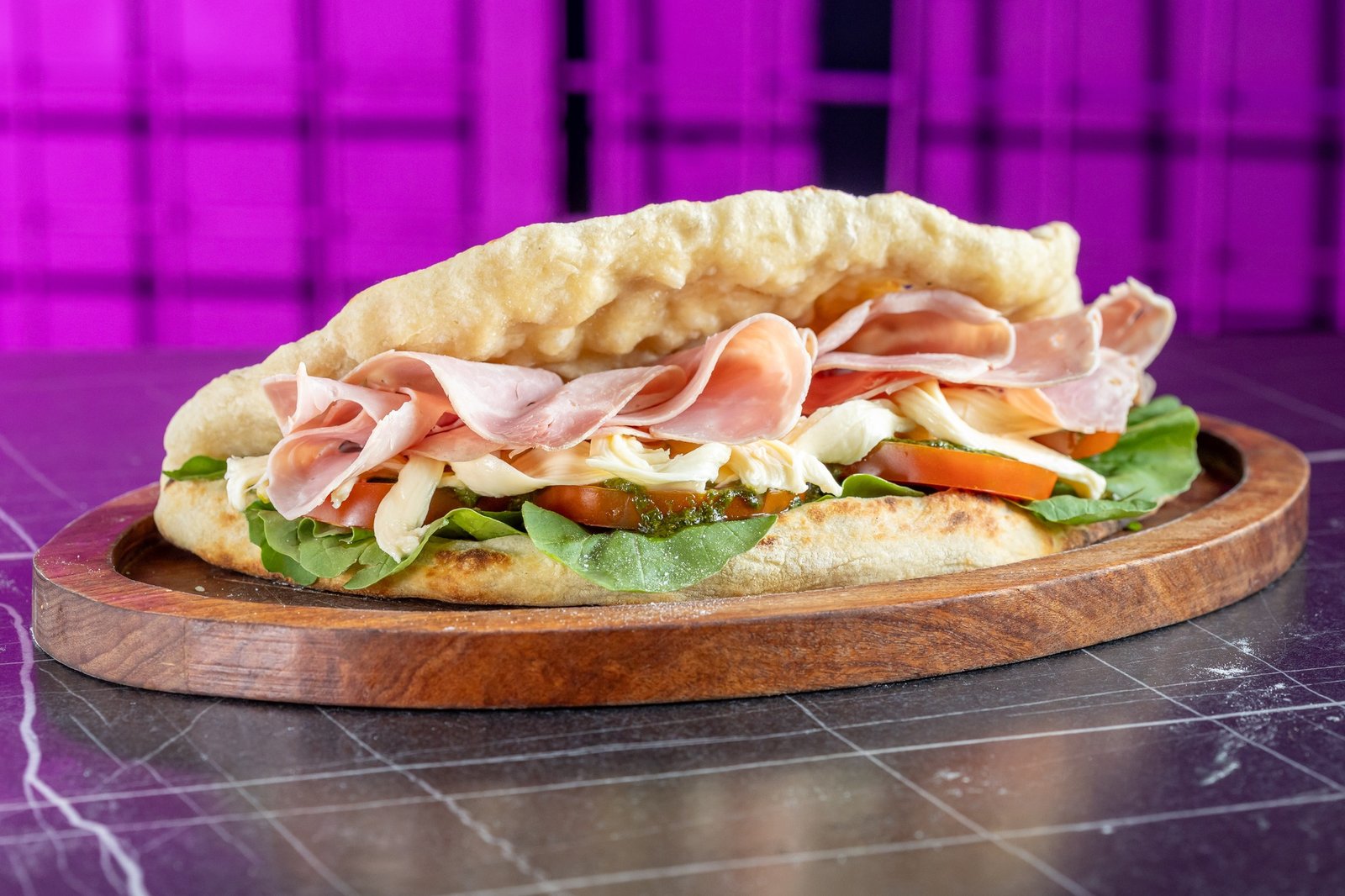 Sandwich asiático de Bondiola (2 personas) 95 Bs. : En masa de pizza, relleno con bondiola de cerdo a la parrilla, rúcula, barbacoa coreana de tamarindo y alioli de sriracha.