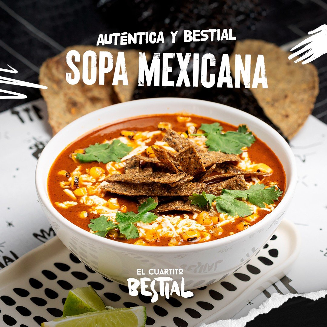 Sopa Mexicana 45 Bs. : Crema de tomate, cebolla, ajo y chile guajillo asados. Sobre una cama de chips de tortilla de maíz frita, queso criollo, jalapeños y choclo asados.