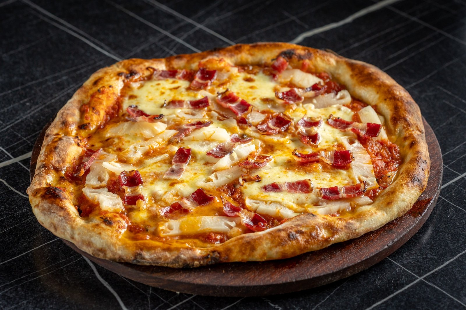 Hawaiana 89 Bs. : Salsa de tomate, mozzarella italiana, piña, tocino y aceite de oliva virgen extra.