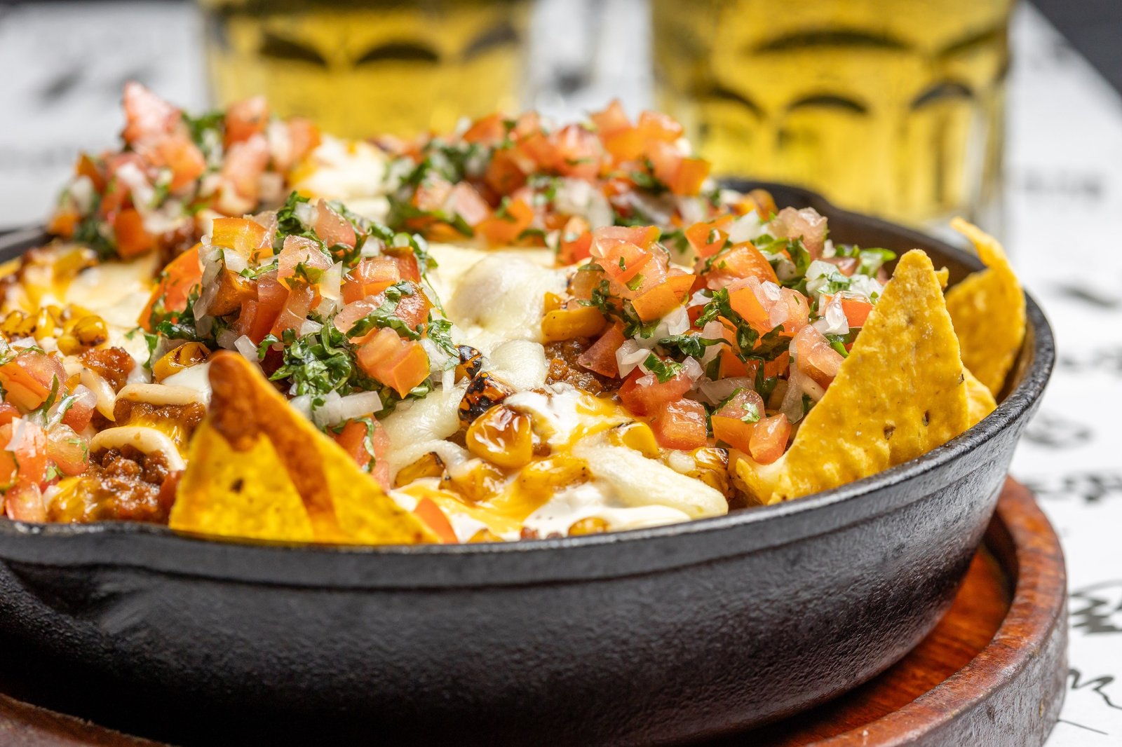 Nachos Bestial 110 Bs. : Nachos, carne salteada en cerveza, jalapeños y choclos asados, queso cheddar fundido, queso mozzarella, crema agria de tocino frito y pico de gallo.