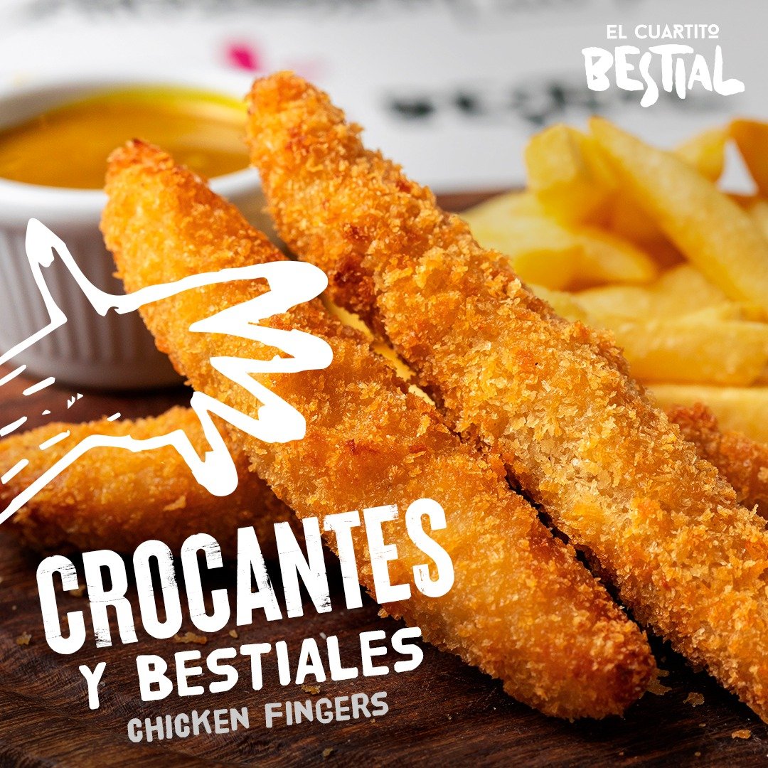 Chicken Fingers 35 Bs. : Bastones de pollo, marinados y apanados en panko, acompañados de salsa a elección (miel y mostaza o BBQ) (3 unidades)