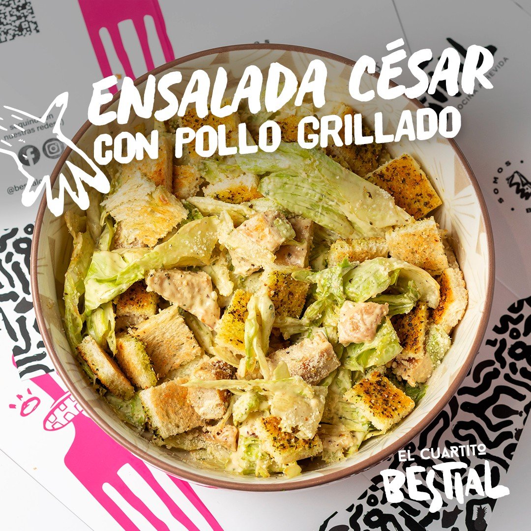 Ensalada Cesar con Pollo Grillado 49 Bs. : Lechuga Fresca, Pollo grillado, salsa césar, croutones y queso parmesano.