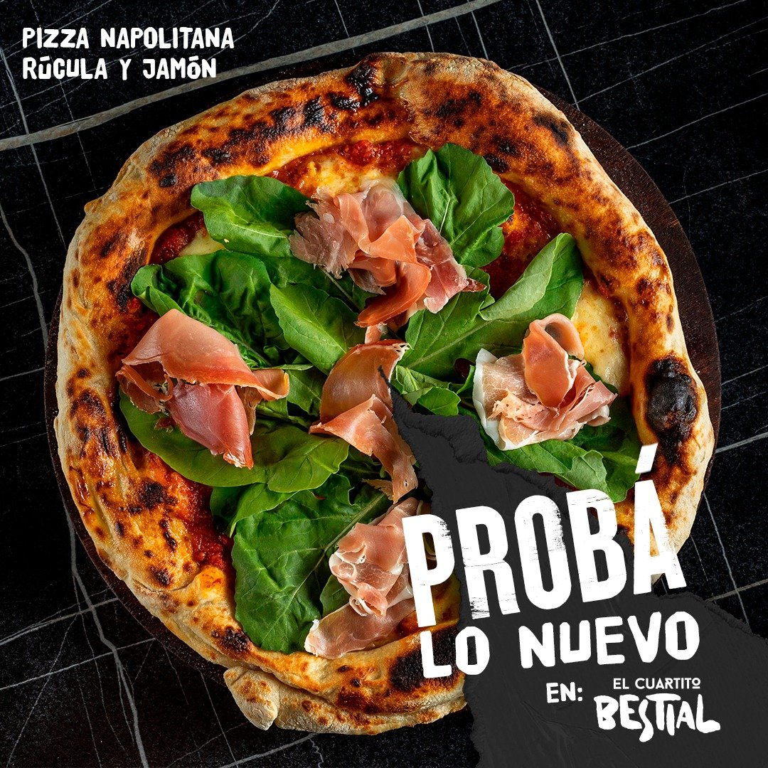 Rúcula y Jamón 99 Bs. : Salsa de tomate, mozzarella italiana, jamón serrano, rúcula, parmesano y aceite de oliva virgen extra.