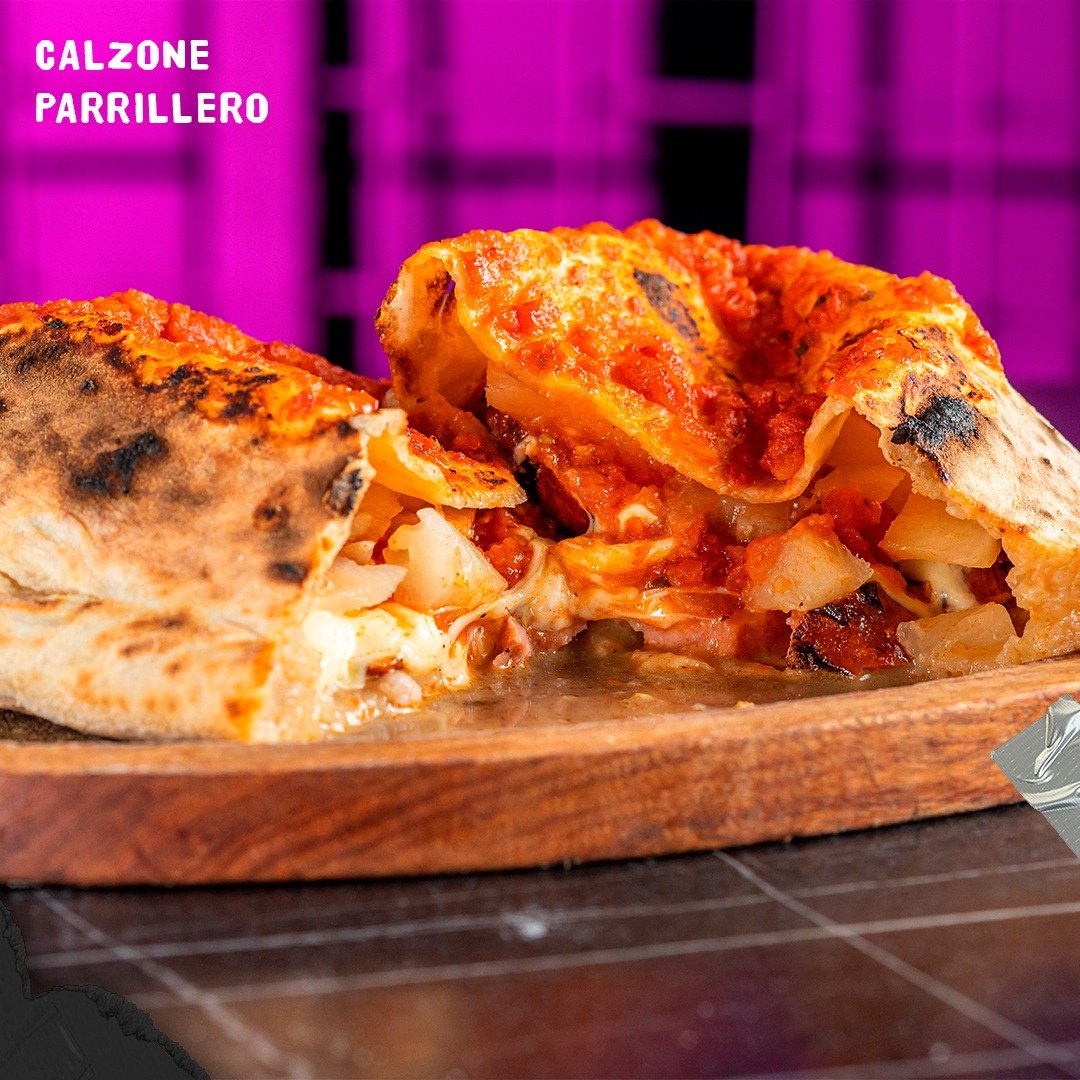 Calzone Parrillero 89 Bs. : Salsa de Tomate, mozzarella italiana, chorizo y piña a la parrilla y aceite de oliva virgen extra.