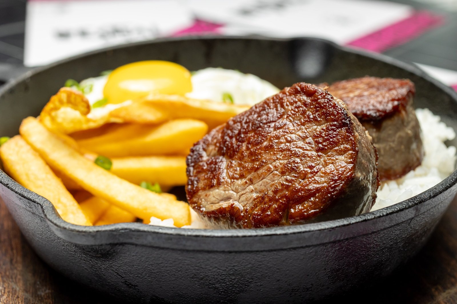 Lomito Montado 70 Bs. : 200 gr de lomito, acompañado de arroz blanco, papas fritas con alioli de sriracha y huevo frito.