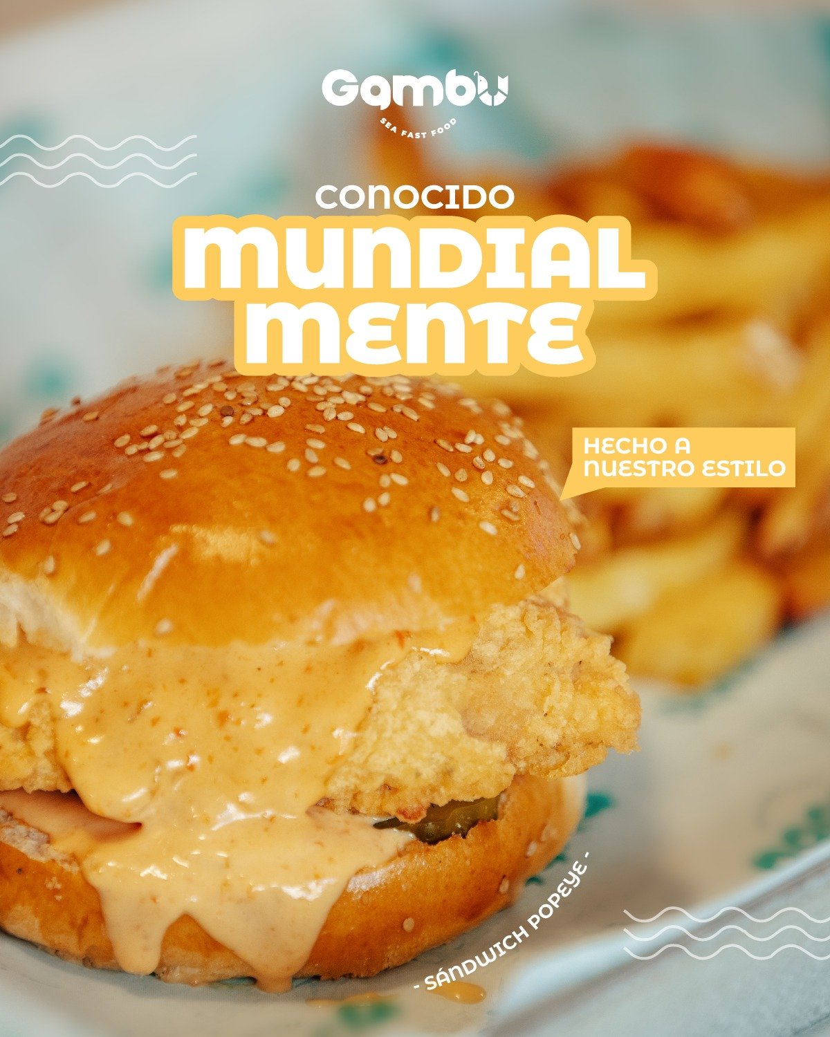 En Gambu Sea Fast Food, te invitamos a probar nuestras deliciosas especialidades como los tentáculos de pulpo, camarones crujientes y el irresistible sandwich Popeye de pollo. Si eres fanático de los mariscos, nuestras pipocas de calamar y aros de calamar son una opción perfecta para comenzar. Además, no puedes perderte nuestros sabrosos tenders de pollo y el delicioso pollo a la canasta, perfectos para compartir con amigos o disfrutar solo.