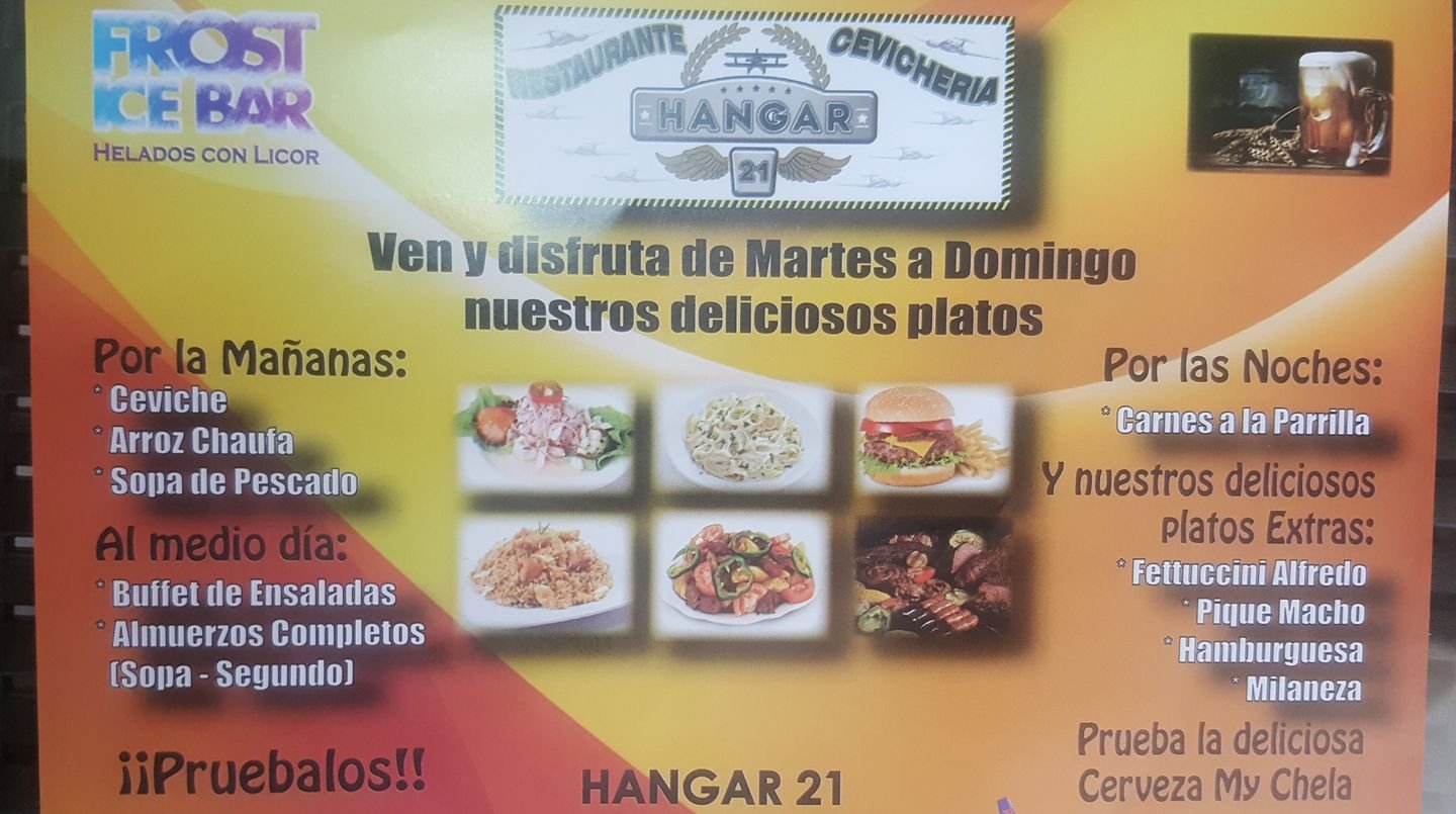 En Hangar 21, comenzamos tus mañanas con ceviches frescos, perfectos para despertar tu paladar, y un delicioso arroz chaufa que combina lo mejor de la cocina peruana con un toque local. No olvides probar nuestra sopa de pescado, un clásico que reconforta el alma.