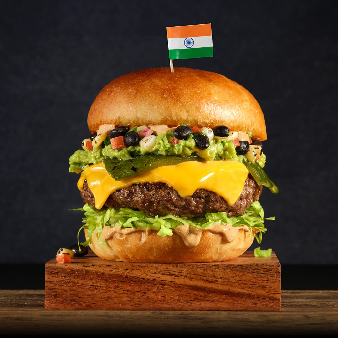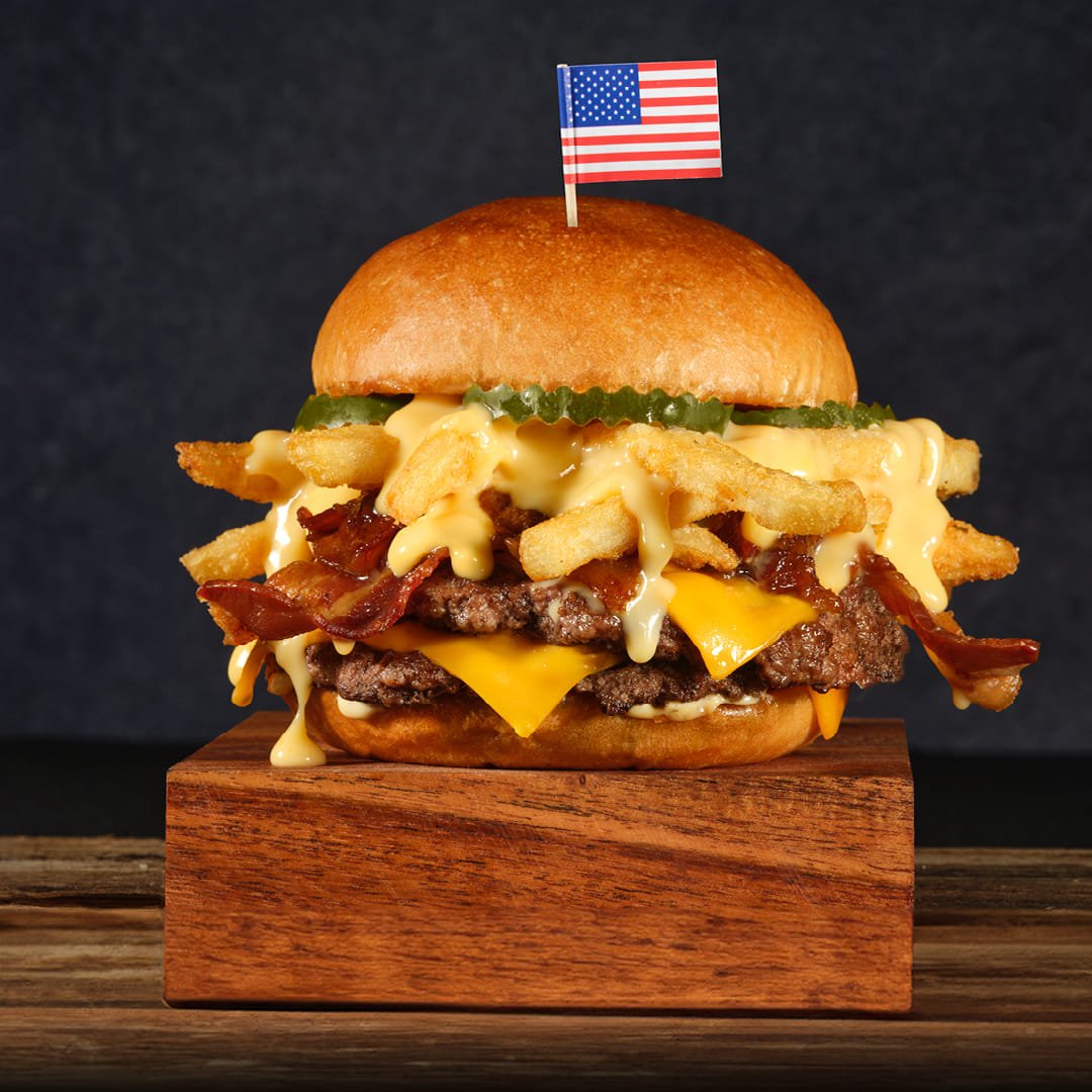 Sazonado con espresso, salsa de jalapeño, cebolla crujiente, queso cheddar derretido, tocino ahumado, lechuga crujiente y tomate. Coronado con un jalapeño frito.*