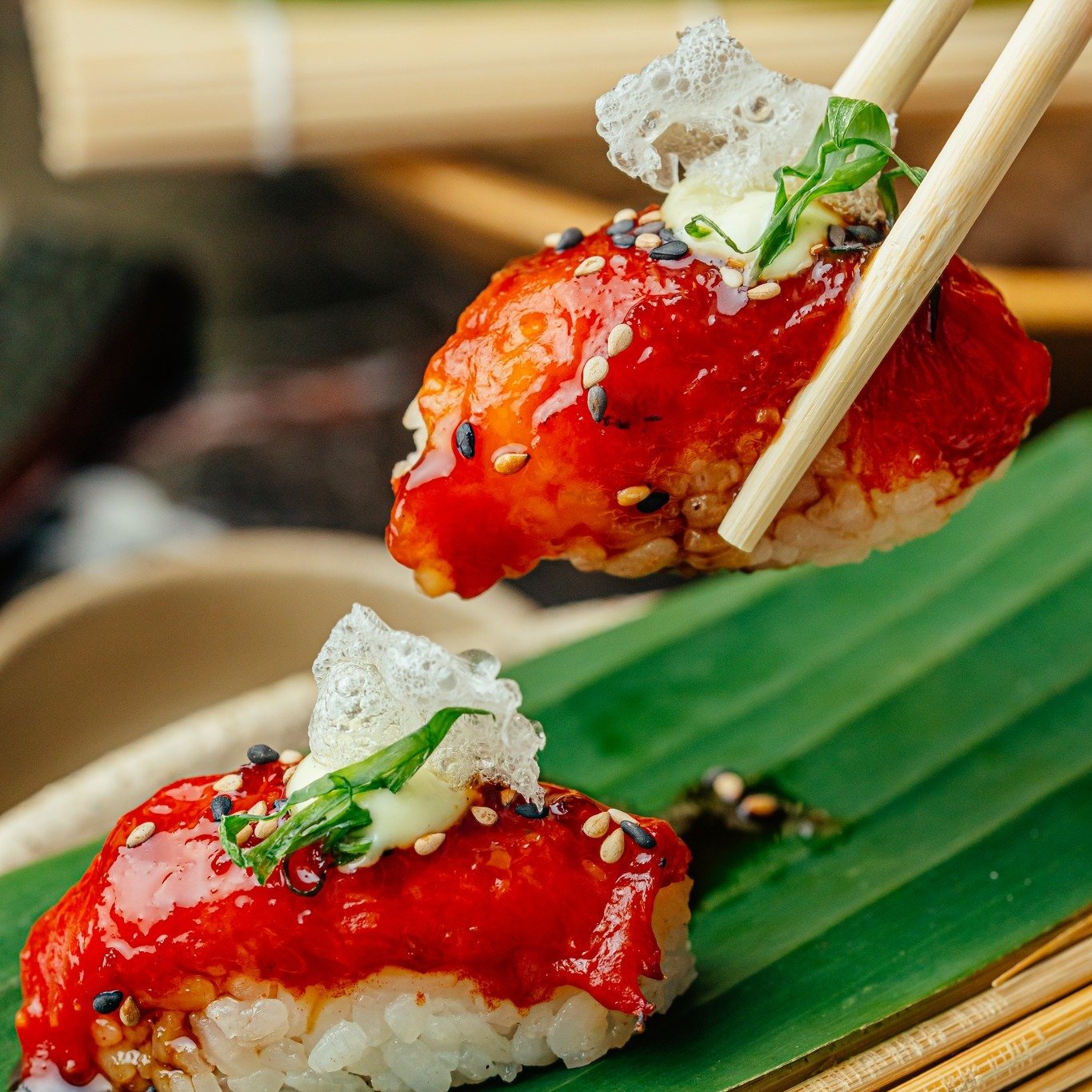 SAMURAI: Ebi nigiri, tare achachairú, sésamo y ajo crocante.