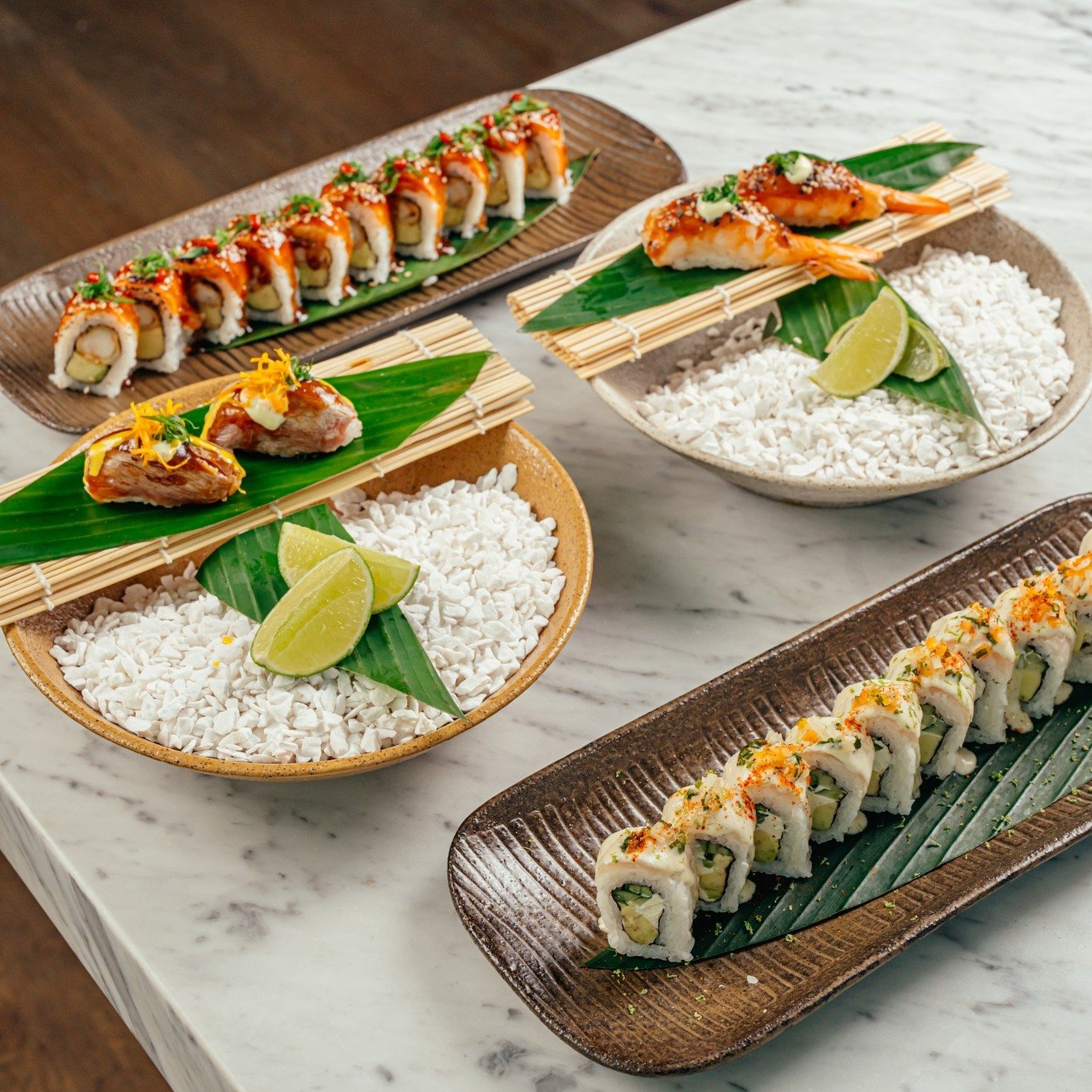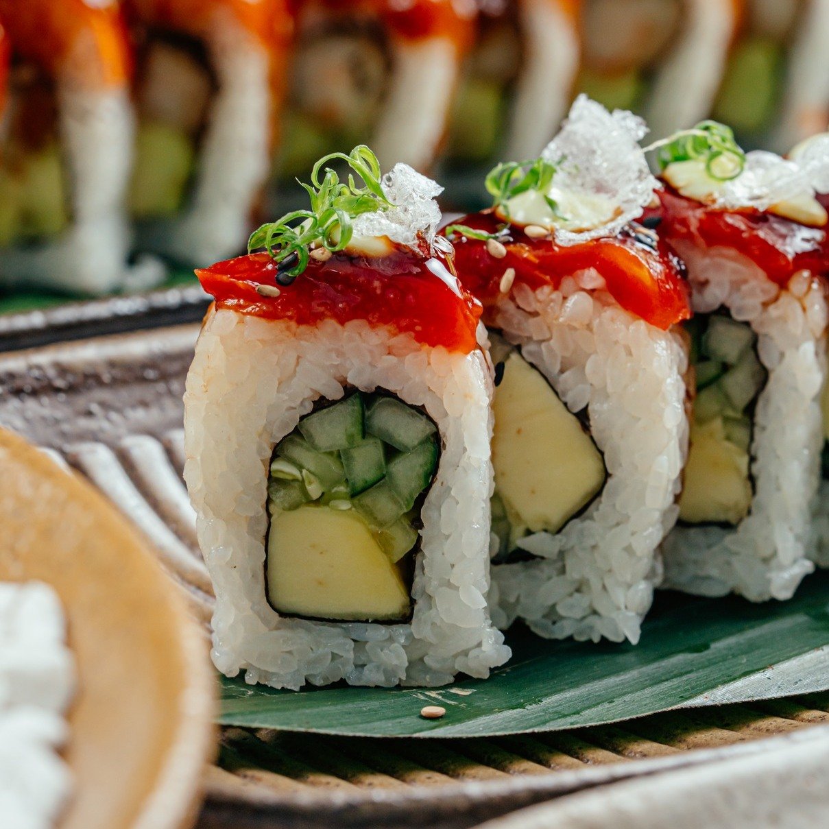 MASHARU MAKI : Paiche, langostino furai, palta, pepino, salsa melcocha, chalaca tokio, laminas de arroz crocante, togarashi y ralladura de limón.