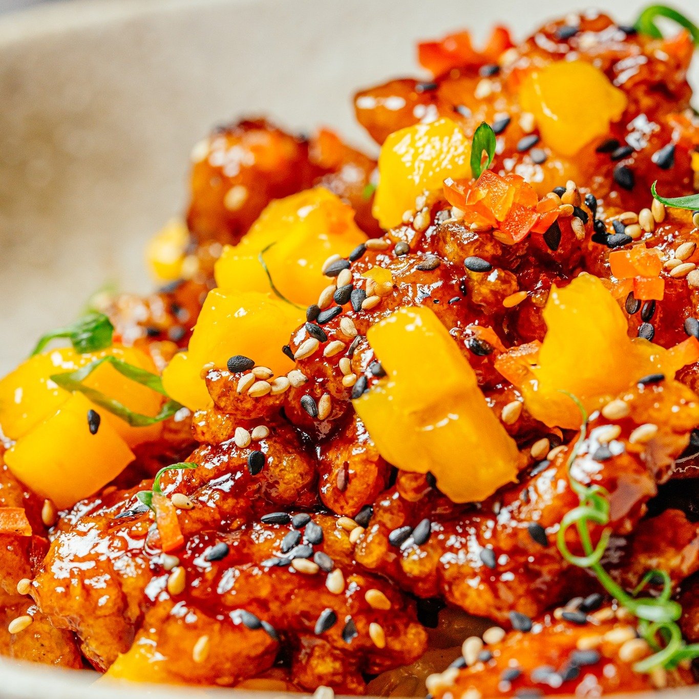 CAMARONES MELCOCHA 89 Bs. : Laqueados en salsa agridulce, chalaca tokyo, hierba buena, maní y láminas de arroz crocante.