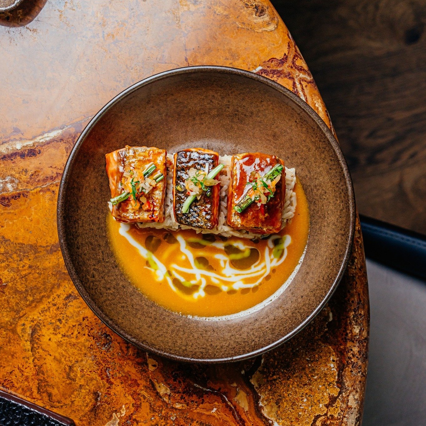 TRUCHA KUNSEI: Trucha, miso panca, ají asiático, ajo crocante y chimichurri.