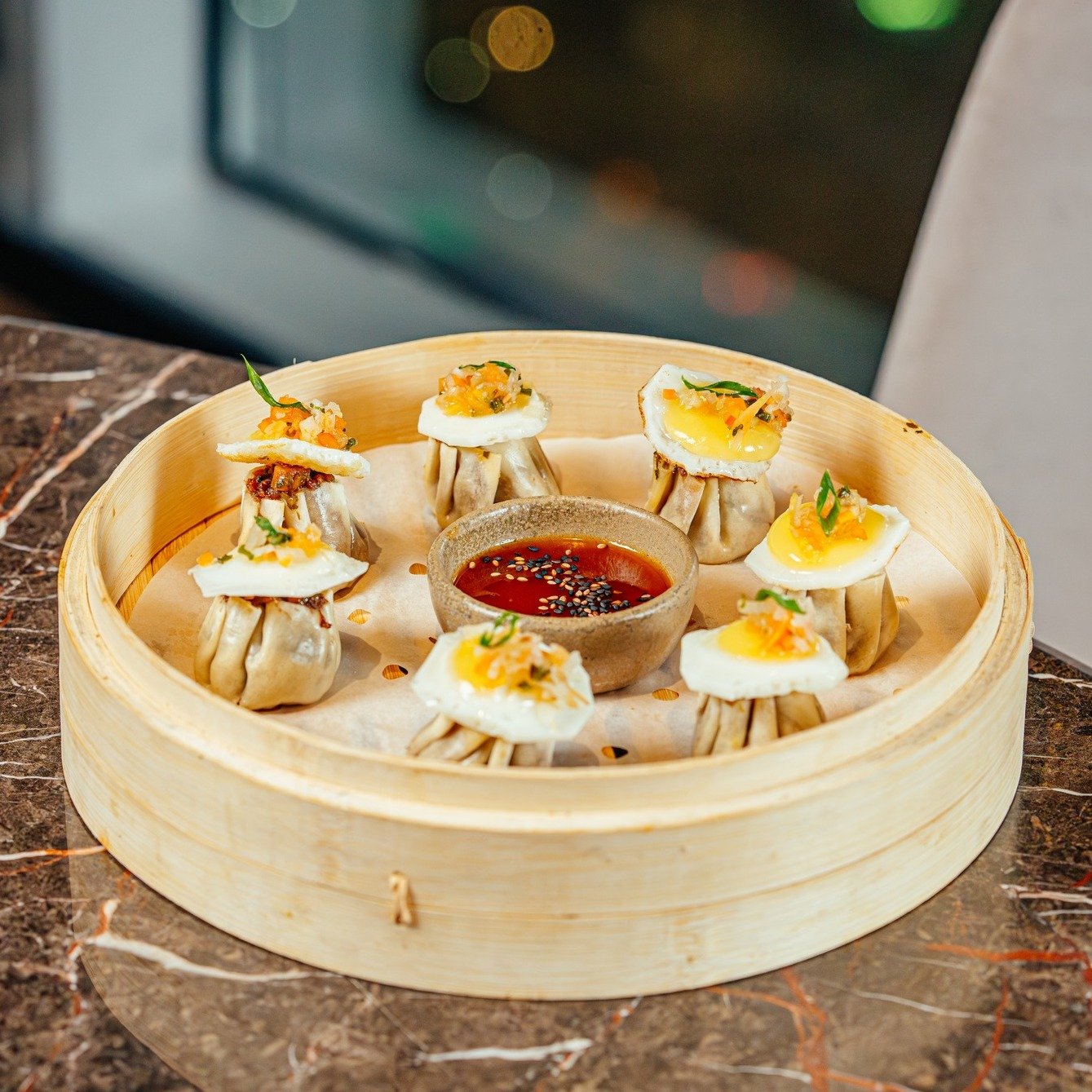SIU MAI A LO POBRE 75 Bs. : De lomo y cerdo, huevo codorniz, chalaca tokyo y chimichurri.