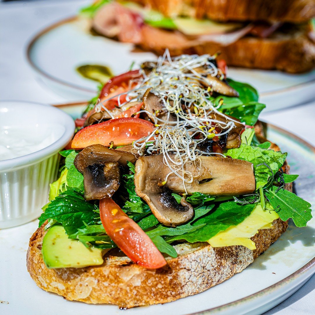 Pan de masa madre con palta, champiñones salteados y salsa de yogurt griego.
